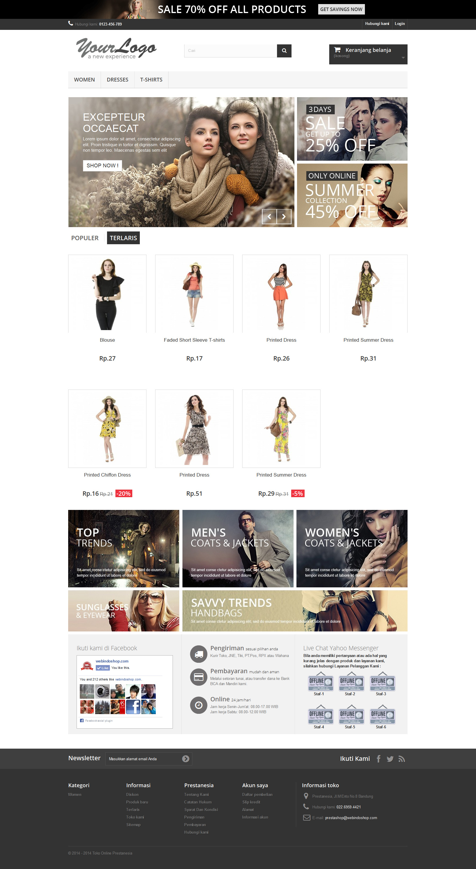 - Tema : default-bootstrap (responsive atau otomatis menyesuaikan dengan perangkat pengguna Desktop, Notebook, Netbook, Tablet, Smartphone)