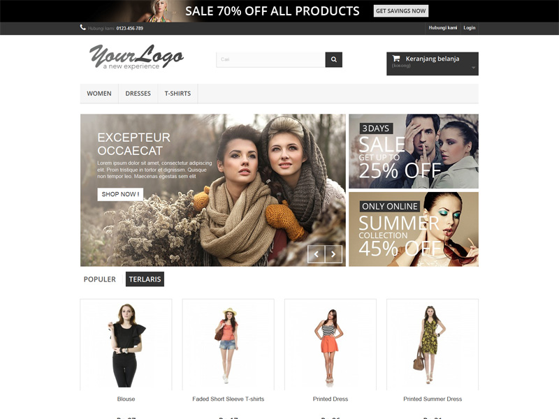- Tema : default-bootstrap (responsive atau otomatis menyesuaikan dengan perangkat pengguna Desktop, Notebook, Netbook, Tablet, Smartphone)